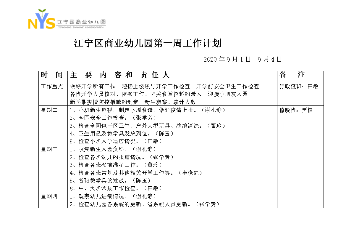 江宁区商业幼儿园第一周工作计划
