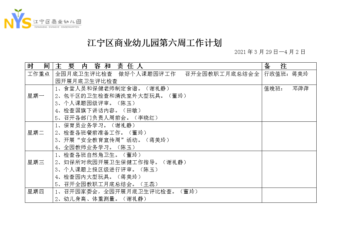 江宁区商业幼儿园第六周工作计划