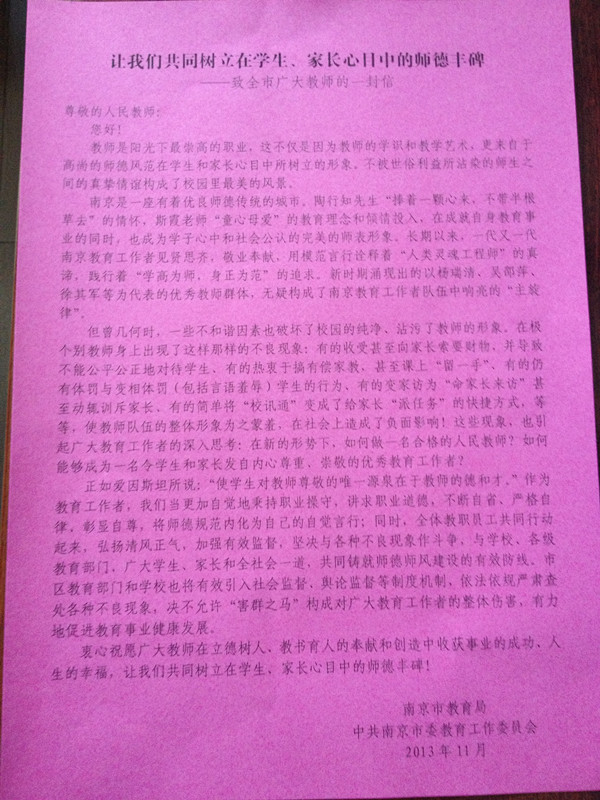 2013年11月8日,我园积极响应区教育局的号召,利用午休的时间学习“师德师风建设工作会议“的精神。全体教职工共同行动起来,弘扬清风正气,坚决与各种不良的现象作斗争,共同铸就师德师风建设的有效防线。