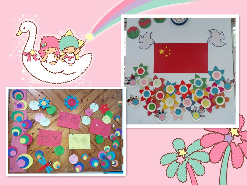 2014年9月29日星期一,为了迎接国庆节的到来,让幼儿了解十月一日是祖国妈妈的生日,我们中班年级组开展了“庆国庆”活动。我们让爸爸、妈妈和孩子一起对祖国母亲说一句祝福的话,并记录下来,让幼儿知道祖国母亲的伟大!同时我们开展了绘画活动,“给祖国母亲做蛋糕”,激发幼儿热爱祖国的情感! 看我们中班宝贝们画的多么认真啊!每个人脸上洋溢着开心的笑容!