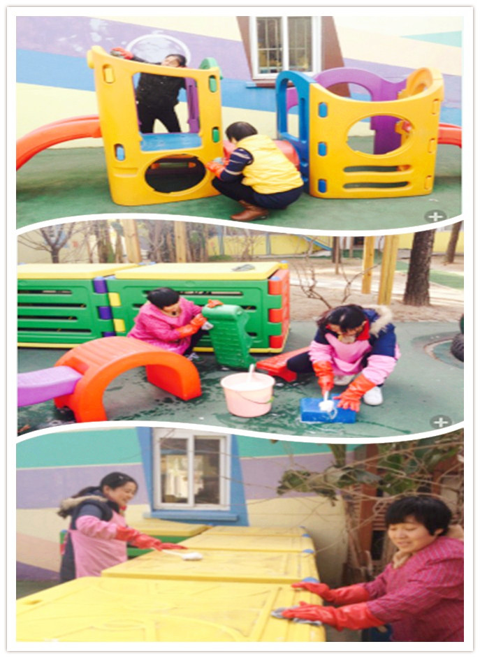 2015年1月9日中午,商业幼儿园的保育老师,对幼儿园内的户外大型玩具进行清洗。 冬季也是各类传染病的高发期,我园对各班提出以下要求:1、认真落实一日三检工作;2、认真做好消毒工作;3、做好本班缺勤幼儿的跟踪记录;4、做好传染病的排查工作;5、做好通风换气措施。 除加强班级的清洁、消毒工作外,我园还对户外的大型玩具也进行一次全面的清洗和消毒,防止各种疾病的传播和蔓延。