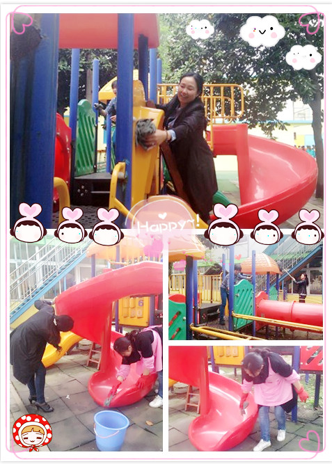 春季是传染病高发季节,为了让孩子们有个干净、整洁、安全的活动的场所,园长亲自上阵带领保育员们给大型玩具做SPA。