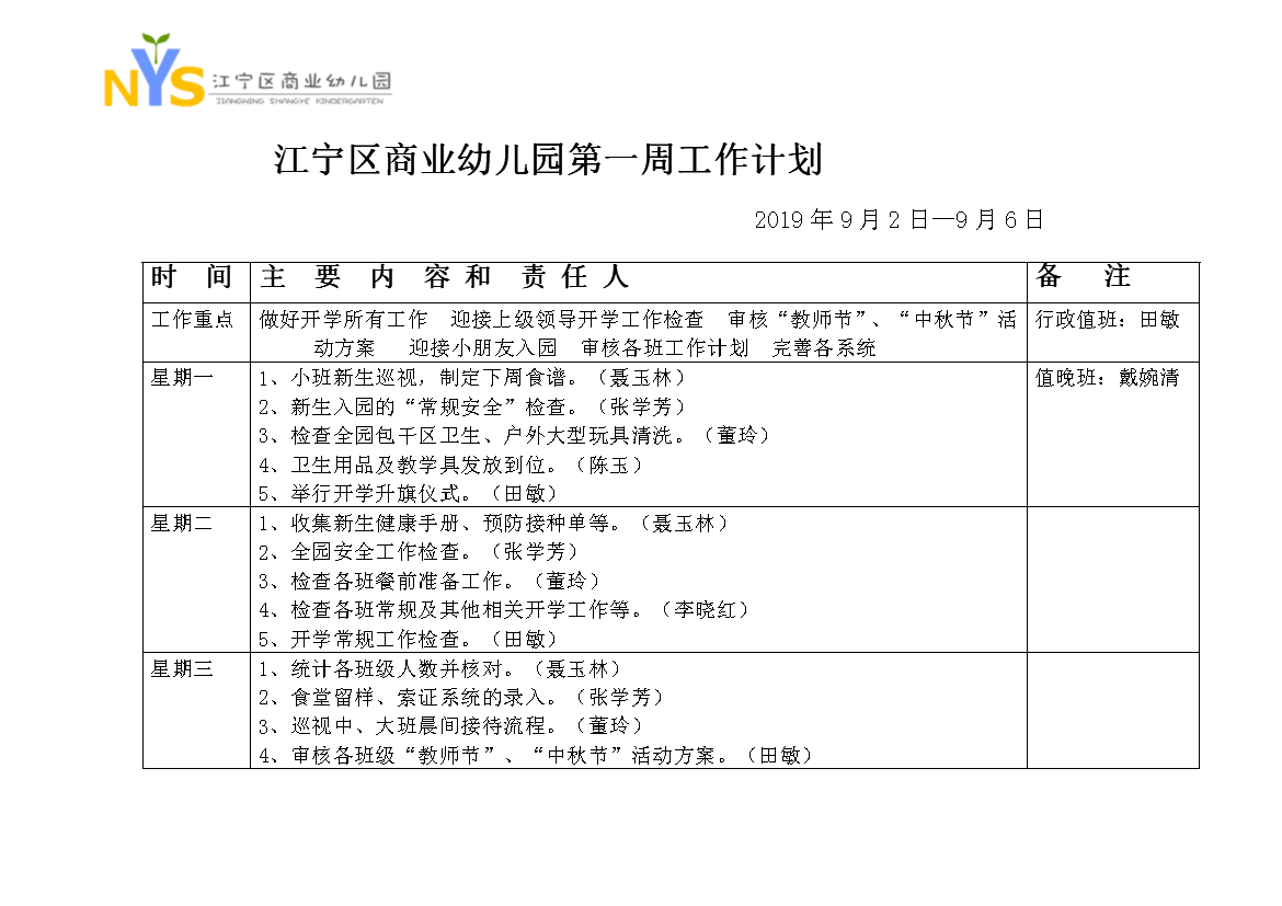 江宁区商业幼儿园第一周工作计划