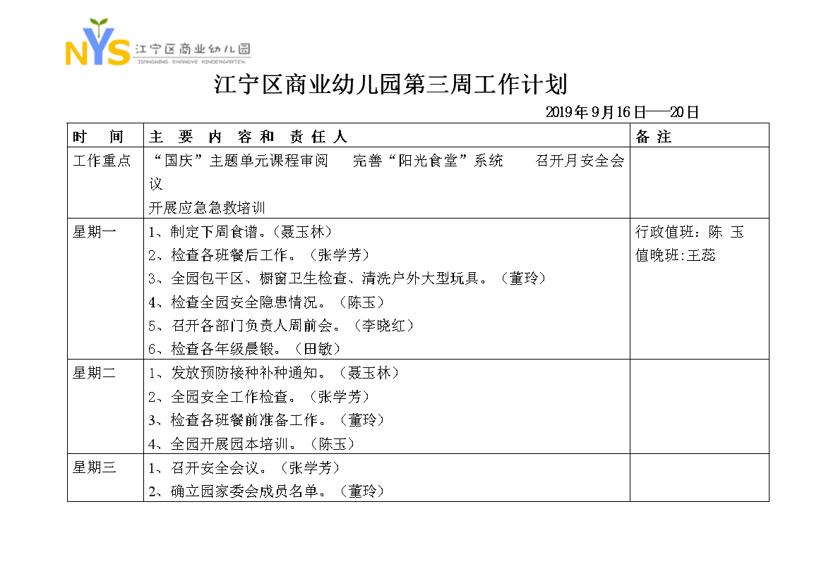 江宁区商业幼儿园第三周工作计划